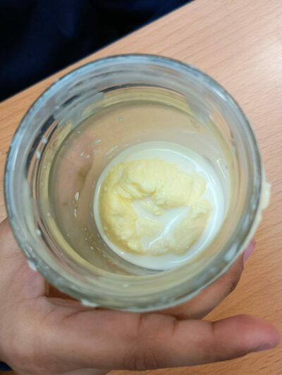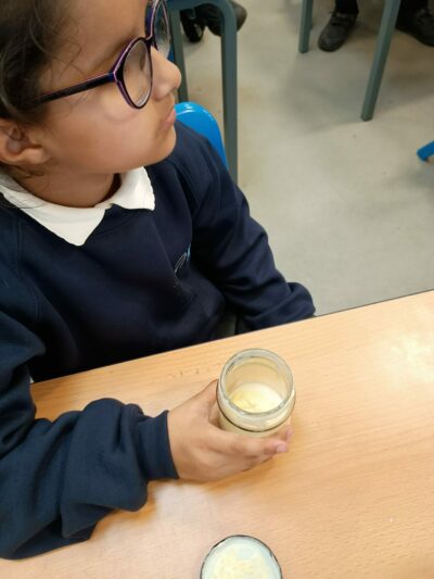 Year four enjoyed a fascinating Science lesson about changing states of matter this afternoon by making their own butter using just cream, a jar and a lot of shaking! Mixing air (a gas) with the cream separates the liquid buttermilk from the solid butterfat, creating something you can add to your toast. Fascinating lessons helping us to achieve well at Dixons Manningham.